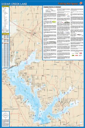 Cedar Creek Lake, Texas Waterproof Map (Fishing Hot Spots)A fairly shallow warmwater lake that sustains thriving populations of largemouth bass and white bass. A 12-pound largemouth stands as the current lake record and 3-pound white bass are common. Nice hybrids too. This map is clean, easy-to-read, and detailed map of the lake. It has a latitude/longitude grid and GPS coordinates. Fishing tips and techniques are included. Size - 24 x 36